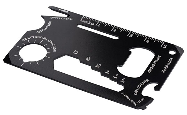 This handy credit card-sized tool stands out due to its multifaceted features and its compact form. This tool is an ideal companion for travel and outdoor adventures as it easily fits into wallets, trouser pockets, or backpacks.. This multitool is crafted from high-quality, black-coated stainless steel, offering 8 functionalities: bottle opener, can opener, ruler, screwdriver, hex key, protractor, package opener, and wingnut driver. With this versatile device, one is well-equipped for everyday eventualities.