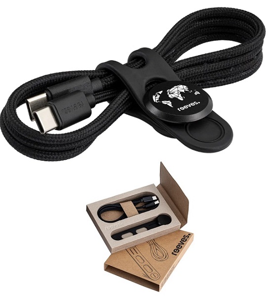 A branded sample can perfectly demonstrate the advertising impact of a tangible logo. Use this laser-engraved sample to impress your customers! Using this silicone cable tie, a cable can be wound and stored easily and compactly. The engraving is applied to the round plate made of recycled aluminium. The included USB-C to USB-C charging and data cable is made from recycled PET and TPE plastics. Depending on the device, adapter and power source, the charging cable offers a power output of up to 60 watts, enabling fast and convenient charging.