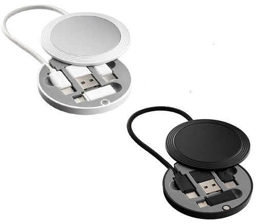 This 4-in-1 cable set is a smaller and lighter evolution of the REEVES-myConvertics. The charging and data cable with up to 60 watts offers particularly high charging comfort. The cable set is made from recycled ABS, TPE, PET plastics and recycled aluminium. The compact box contains a USB-C to USB-C cable, a USB-A adapter, and an adapter for AppleŽ 8 Pin. The housing can be easily opened by sliding it sideways and securely closed thanks to the magnetic closure.