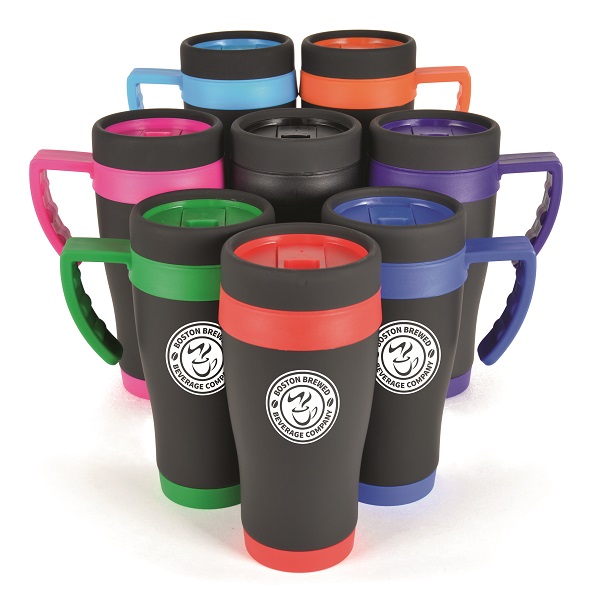 450ml double walled matt black stainless steel travel mug with coloured plastic interior, base, handle, top band and screw top lid with secure sliding sipper.