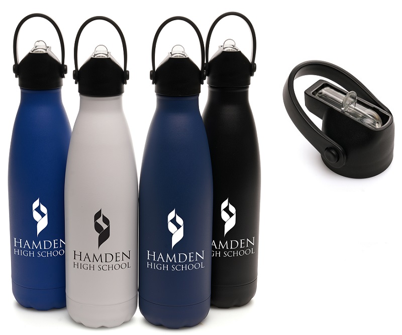 500ml double walled, stainless steel drinks bottle with a powder finish and screw on lid with a flip up straw and handle. (PP plastic lid and handle, PS sipper and PE straw). BPA and PVC free.