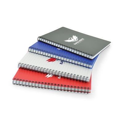 A5 spiral bound notebook with coloured flexible plastic cover and 70 lined white sheets.