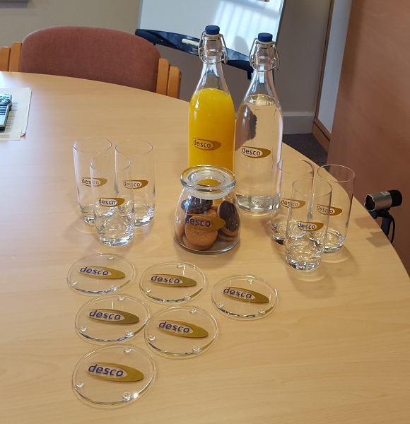 All inclusive meeting room set, 2 1 litre reusable water bottles, 1 cookie jar, 6 highball glasses, 6 coasters (includes origination, branding and delivery to 1 UK mainland address)