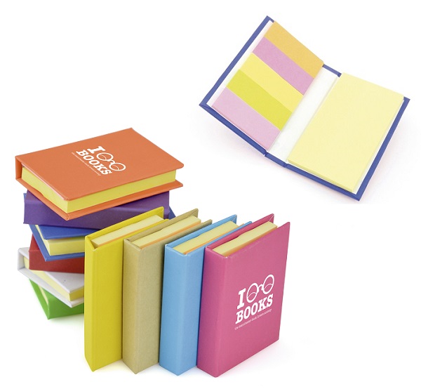 Small hard back book with yellow sticky notes and five sets of coloured flags. Flags coloured pink, amber, yellow and green. A great promotional gift for any office environment.