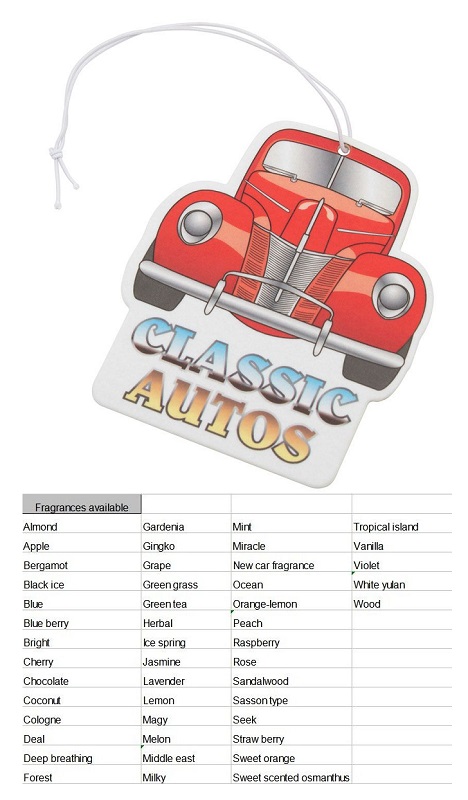 A fully bespoke air freshener made from an absorbent paper board printed up to full colour on both sides. Perfect for promoting companies or brands while keeping vehicles smelling sweet. Air fresheners are particularly suitable for automobile-related businesses ranging from garages and dealerships to companies offering auto insurance or valeting and detailing services.