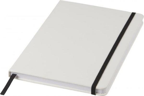 Spectrum A5 white notebook with coloured strap. White A5 notebook with coloured elastic closure and ribbon. Includes 80 sheets (60g/m2) lined paper. Digital print possible on cover. Cardboard, PVC Plastic.
