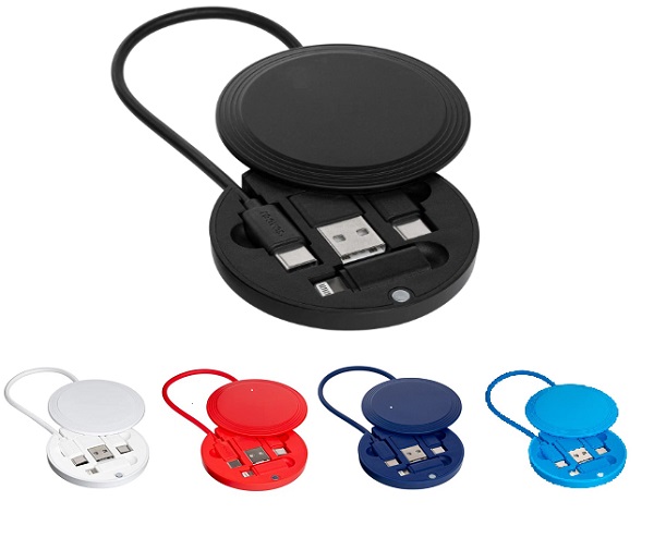 In the handy flat housing, there is a USB-C to USB-C cable, a USB-A adapter, and an AppleŽ 8 Pin adapter. To open the lid, turn it sideways either clockwise or counterclockwise. The box can be securely closed with the built-in magnets.